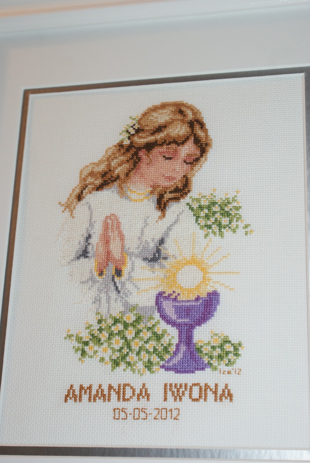Z drugim bylo troche trudniej. Komunia miala byc 13-go maja, a czas uciekal jak szalony. Po egzaminach napadlo mnie ogromne zmeczenie. Padalam o godzinie 20-tej jak male dziecko po caladziennej zabawie na swiezym powietrzu. Nie moglam sie zmusic do dluzszego siedzenia. Bylam juz gotowa na wsadzenie karteczki do koperty z przeprosinami za spoznienie. Ale nie musialam tego robic. Pojechalam z dziecmi na msze komunijna o 11-tej. Pomiedzy msza a przyjeciem bylo jeszcze trzy godziny poslizgu. Wrocilam do domu, siadlam z igla i do nikogo sie nie odzywalam. Skonczylam obrazek z praniem i obsadzeniem w ramke dokladnie 14:55, a impreza zaczynala sie o 15-tej. Poniewaz restauracja znajduje sie blisko mojego domu, spoznilismy sie tylko studencki kwadrans. Jestem z siebie dumna.